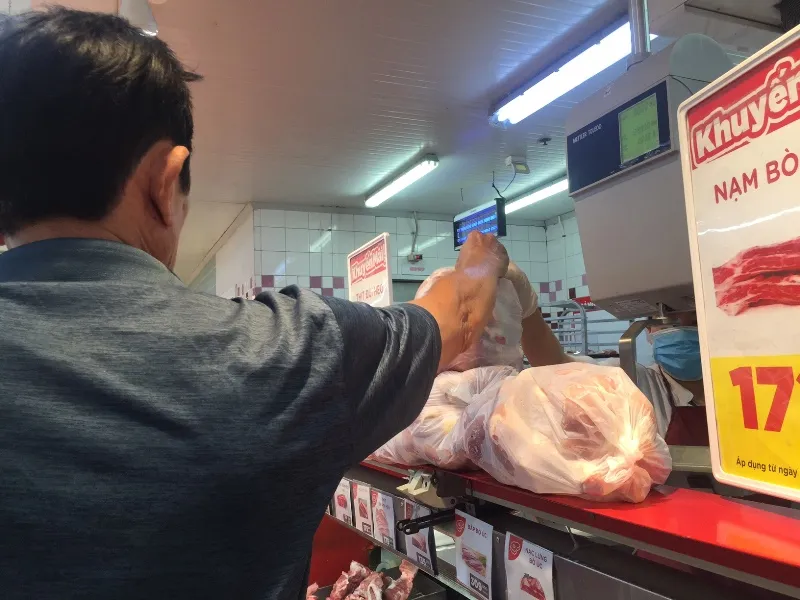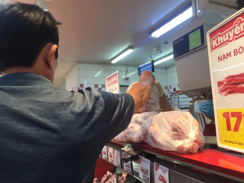Một khách hàng nhanh chóng chọn từng miếng đùi gà cho vào bốn bịch đến quầy cân ký. Người khách này cho biết vì làm quán ăn thấy giá rẻ nên mua nhiều và nhà ở gần siêu thị mua luôn một lần cho tiện.