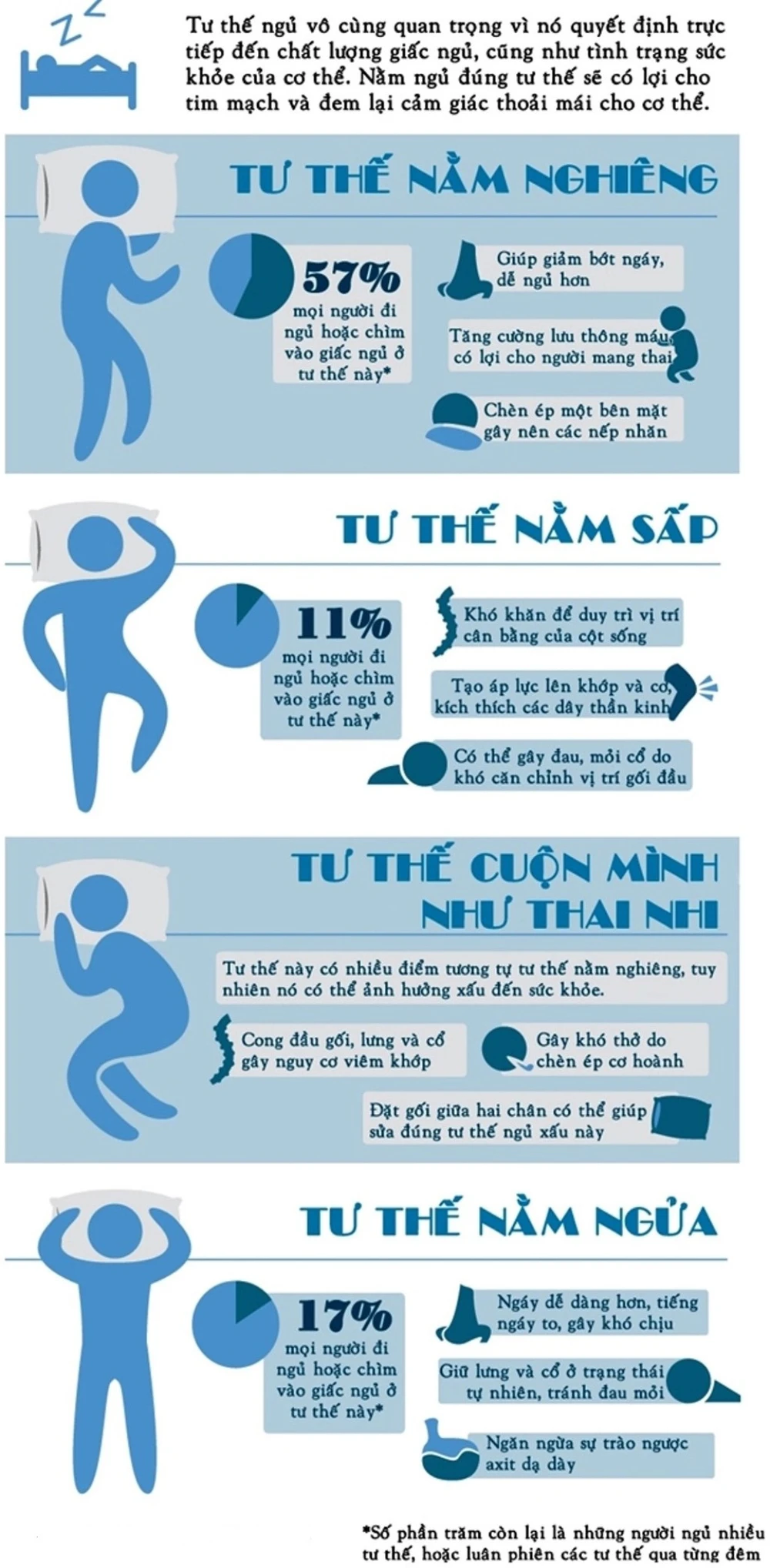 57% người ngủ ở tư thế nằm nghiêng giúp giảm ngáy và dễ ngủ hơn; 11% ngủ sấp có thể gây đau do tạo áp lực lên khớp, cơ và dây thần kinh (theo Healthytimes).