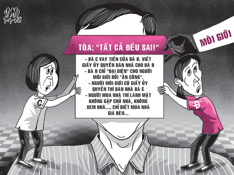 “Tôi giao hết giấy tờ nhà cho bà Đ. Chúng tôi cam kết nếu tôi trả tiền thì sẽ hủy giấy ủy quyền” - bà C. kể. Tuy nhiên, năm tháng sau bà tìm gặp bà Đ. để trả tiền vay và nhận lại giấy tờ nhà thì tá hỏa khi biết bà Đ. đã bán nhà cho người khác với giá 700 triệu đồng, trong khi giá thị trường của căn nhà thời điểm đó khoảng 2,4 tỉ đồng.