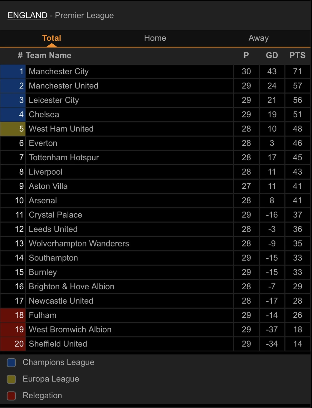 MU có trọn 3 điểm bằng chiến thắng với tỷ số 1-0 để duy trì vị trí nhì bảng với 57 điểm, hơn đội xếp sau là Leicester City 1 điểm. Đội hưởng lợi từ kết quả này lại là Chelsea khi vẫn duy trì vị trí thứ 4 với 51 điểm, hơn West Ham 3 điểm.