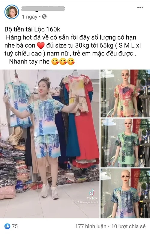 Theo ghi nhận của PLO, tài khoản Facebook cá nhân có tên TAT bán online sản phẩm trên với nội dung quảng cáo: “Bộ tiền tài lộc 160k. Hàng hot đã về có sẵn rồi đây số lượng có hạn nhé bà con đủ size từ 30kg tới 65kg ( S M L XL tuỳ chiều cao ) nam nữ , trẻ em mặc đều được. Nhanh tay nhé”.