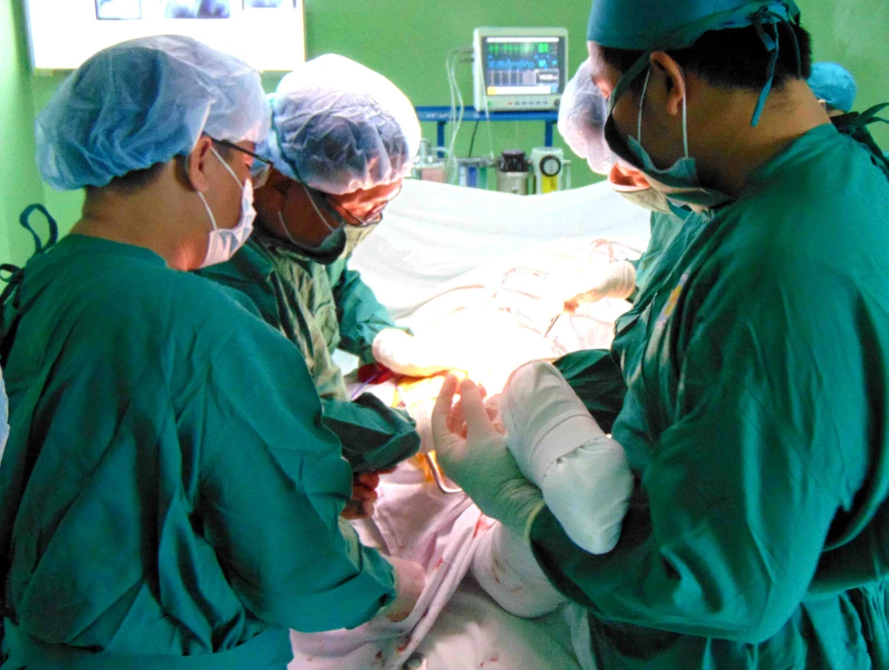 Các bác sĩ đang phẫu thuật chân gãy cho một ông bị tai nạn giao thông vì say rượu. Ảnh: TRẦN NGỌC