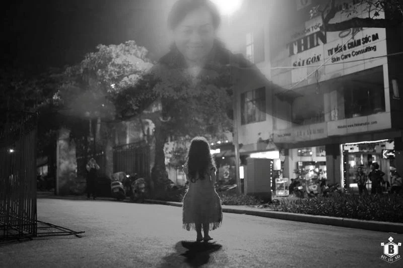 Em bé nhỏ đầu trần, chân đi đất, đang dò dẫm trong đêm tối.