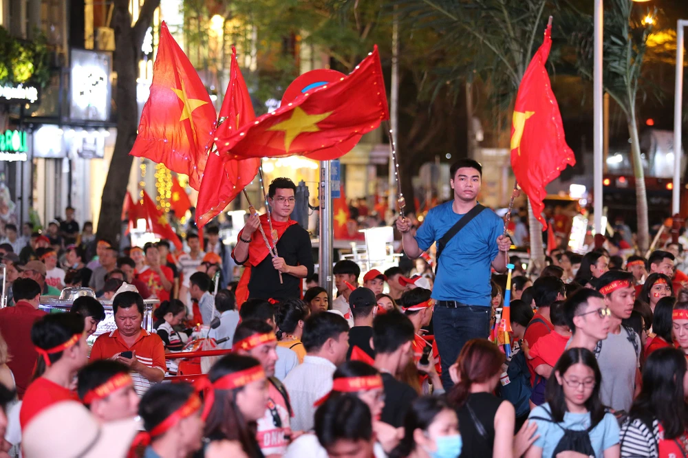 Du khách nước ngoài hòa vào không khí cổ vũ đội tuyển VN trên phố đi bộ.
