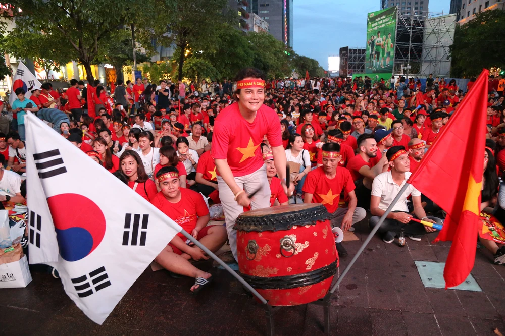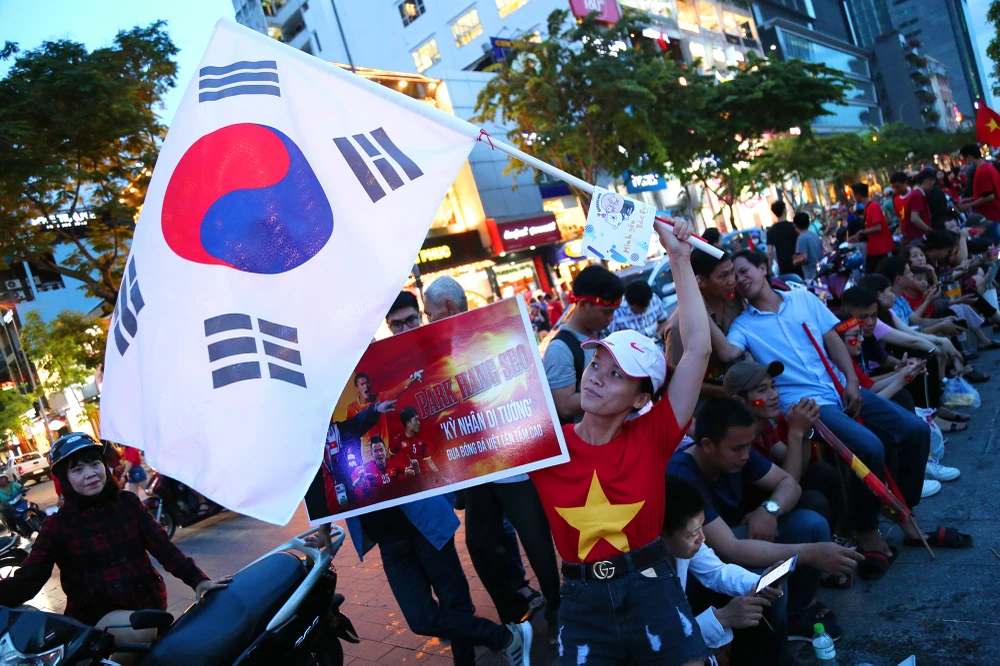 Hình ảnh thầy trò HLV Park Hang-seo và quốc kỳ Hàn Quốc được các CĐV mang lên phố cổ vũ.
