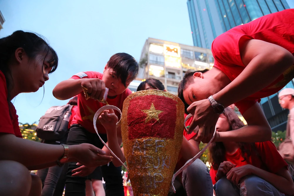 Nhóm bạn Châu Nguyên Khôi (Bình Thạnh) tập hợp hơn 40 người bạn đến phố đi bộ tự làm chiếc cúp vô địch để cổ vũ đội tuyển.