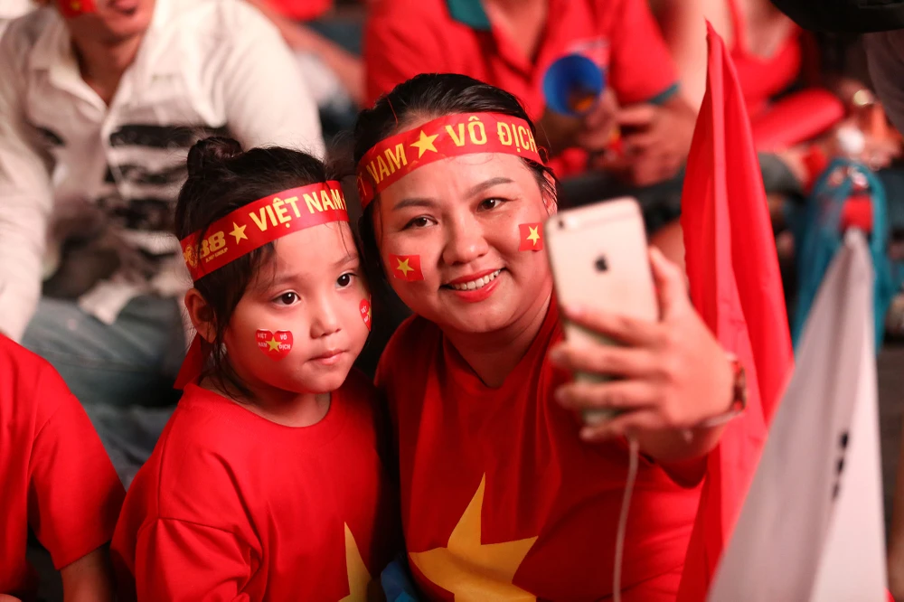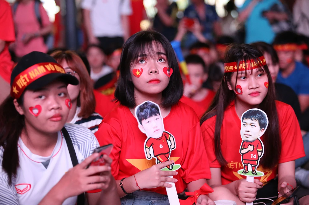 Các cổ động viên nữ mang hình ảnh Xuân Trường, Công Phượng đến phố cổ vũ các anh thi đấu.
