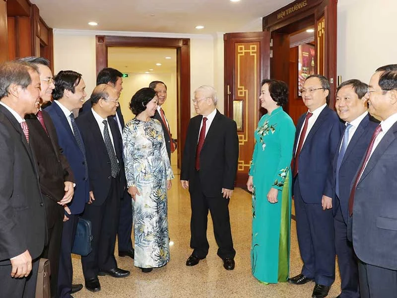 Tổng bí thư, Chủ tịch nước Nguyễn Phú Trọng trao đổi với các đại biểu dự hội nghị. Ảnh: TTXVN