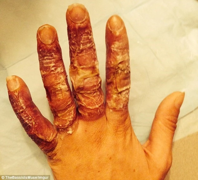 Bàn tay sưng to, phồng rộp của Emma Quirk.