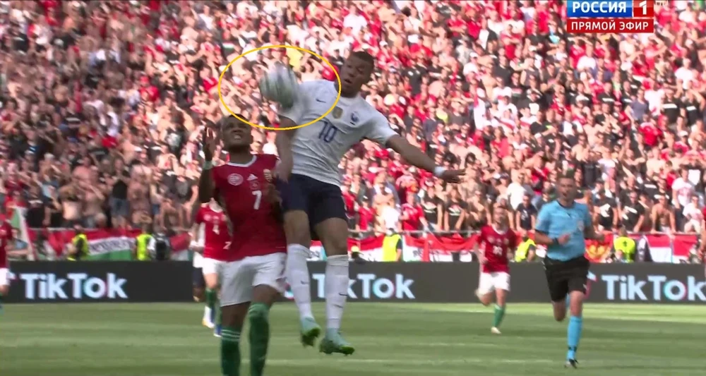 Từ cú chạm bóng bằng tay ngoài vùng cấm của Hungary, Mbappe có những pha xử lý sau đó rồi chuyền dọc vào trung lộ. Hậu vệ của Hungary lùi về hơi quá đà, bóng khẽ chạm nhẹ chân.
