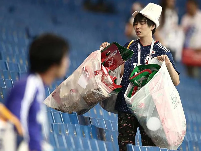 Cổ động viên Nhật đã theo đội ra nước ngoài cổ vũ và ngay sau trận đấu, dù thắng hoành tráng hay thua tức tưởi thì người Nhật cũng không quên rút trong ba lô ra những bao nylon rồi cùng nhau nhặt rác. Họ bỏ rác vào bao, trả lại khán đài sạch tươm như lúc mới vào sân rồi tập kết các bao rác lại một chỗ xong mới chịu ra về. Chuyện này đã thành nếp quen của người Nhật từ lâu và được cả thế giới ngưỡng mộ.
