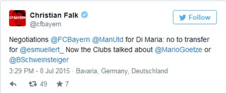 Falk nói rằng Bayern không muốn Thomas Muller tới M.U nhưng sẵn sàng để một trong 2 cầu thủ Mario Gotze hoặc Bastian Schweinsteiger cộng thêm một số tiền cho Man United để đổi lấy sự phục vụ của tiền vệ người Argentina, Di Maria.