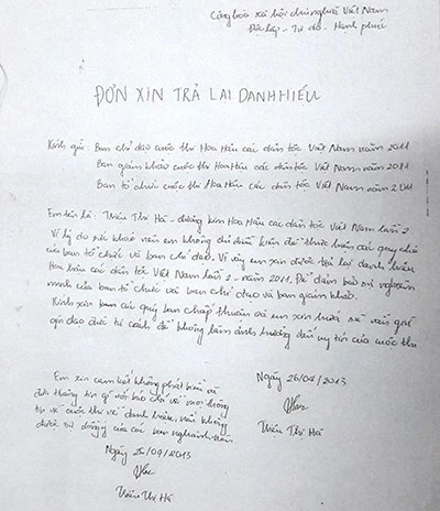 Đơn xin trả lại danh hiệu của hoa hậu Triệu Thị Hà. Trong đơn, hoa hậu cam kết không phát biểu và đưa thông tin gì với báo chí khi chưa được phép. Ảnh: V.THỊNH