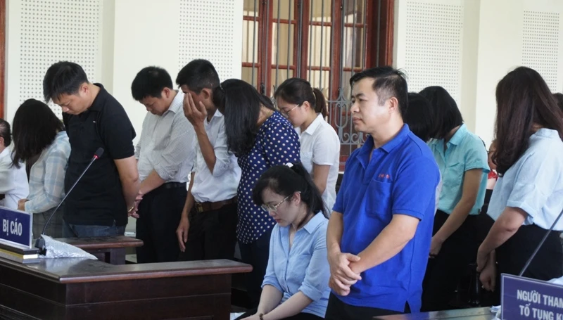 Bị cáo Đặng Đình Hồng (áo xanh) cùng Nguyễn Thị Lam và các bị cáo tại phiên tòa.