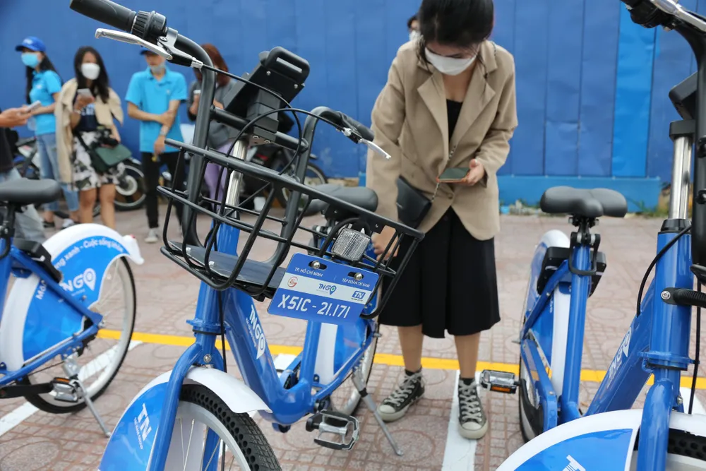 Những chiếc xe đạp màu xanh bắt mắt đã nhận được sự quan tâm, chú ý của không ít bạn trẻ. Đây là mô hình dịch vụ cho thuê xe đạp công cộng ở trung tâm TP đang được triển khai.
