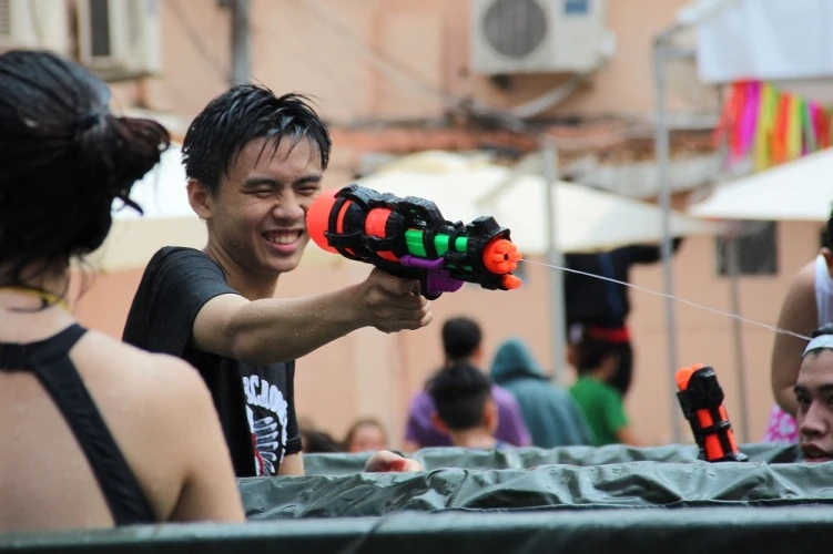 Được trang bị đồ chơi như súng nước đồ chơi, bong bóng nước, xô chậu… lễ hội càng rộn ràng tiếng cười hơn.
