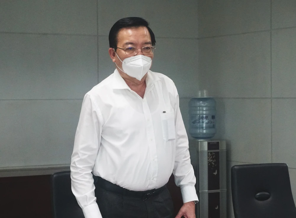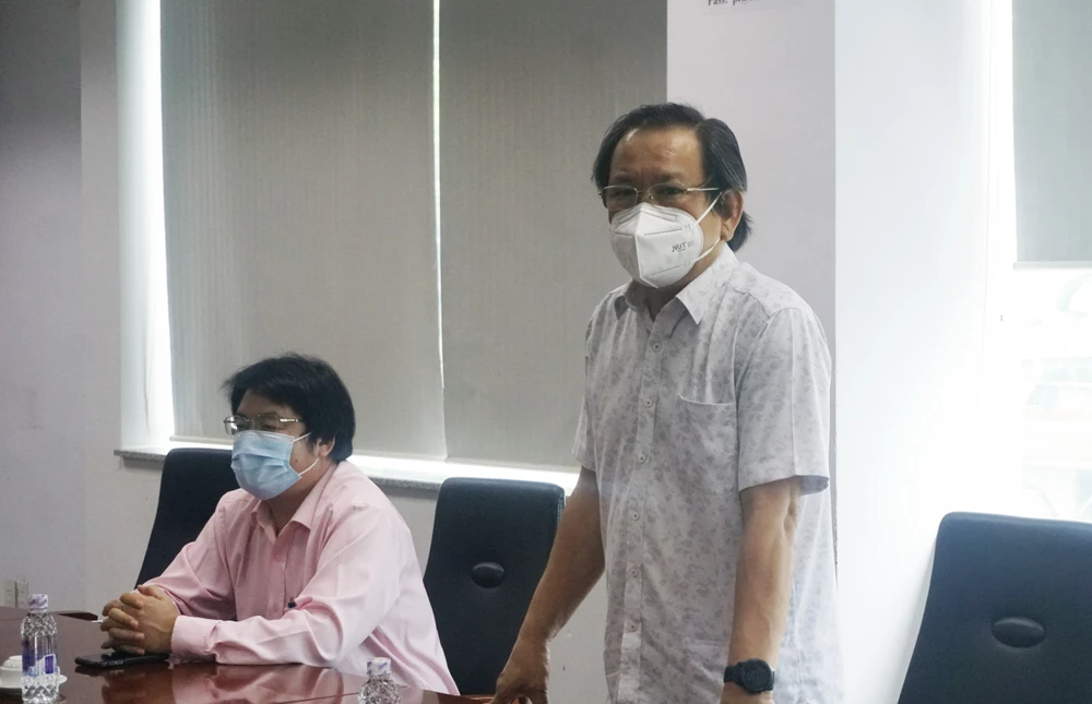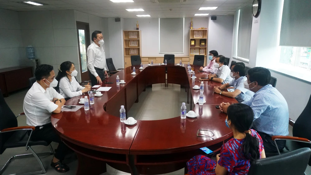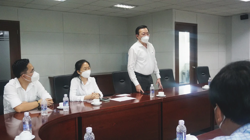 Ông Lê Hồng Sơn - Phó Trưởng Ban Tuyên giáo TP.HCM chia sẻ, động viên đội ngũ cán bộ, công nhân viên đang thực hiện '3 tại chỗ' tại báo.