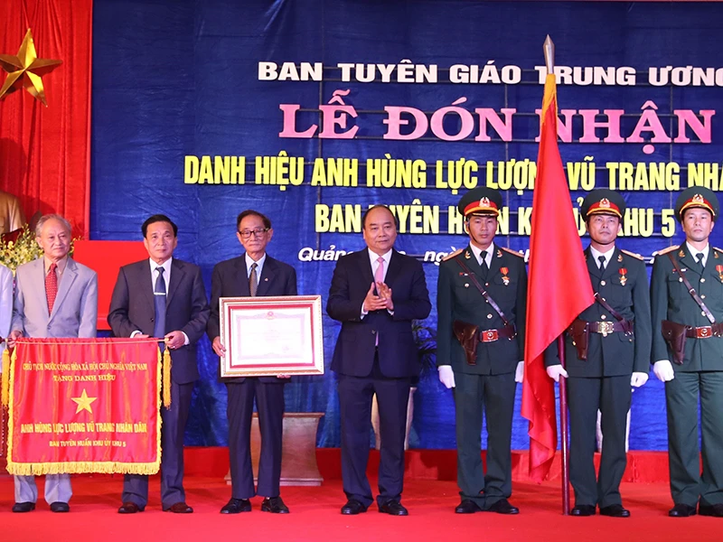 Ủy viên Bộ Chính trị, Thủ tướng Chính phủ Nguyễn Xuân Phúc tham dự và trao danh hiệu Anh hùng lực lượng vũ trang nhân dân về thành tích xuất sắc trong kháng chiến chống Mỹ cứu nước cho Ban Tuyên huấn Khu ủy Khu V.