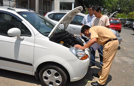 Trách nhiệm của người bán xe chỉ kết thúc sau khi họ thông báo việc mua bán bằng văn bản cho cơ quan đã cấp giấy chứng nhận đăng ký xe. Trong ảnh: CSGT đang xét xe để làm thủ tục đăng ký cho người mua. Ảnh: MP