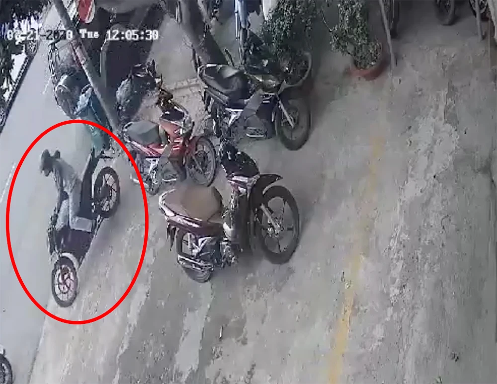Chiếc xe bị hai thanh niên bịt mặt bẻ khoá lấy đi vào trưa 21-7. Ảnh cắt từ camera.