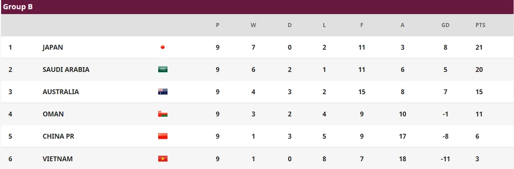 Lượt trận cuối Saudi Arabia tiếp Úc, còn Nhật tiếp tuyển VN. Khả năng cao nhất là Nhật sẽ về nhất bảng B chung cuộc, thứ nhì là Saudi Arabia.
