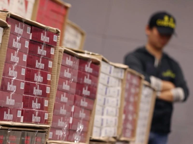 Một cán bộ Hải quan Hong Kong đứng cạnh một lô thuốc lá lậu bị tịch thu. Ảnh: SCMP