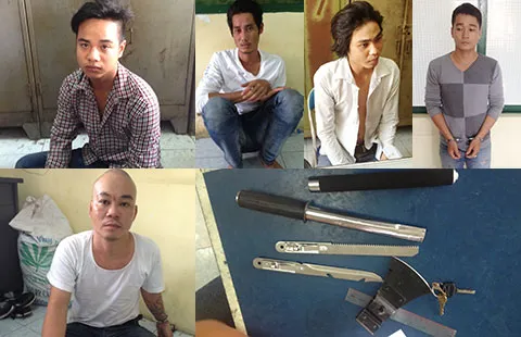 Các nghi can tham gia cưỡng đoạt tài sản nạn nhân TPĐ và hung khí công an thu giữ được. Ảnh: TM