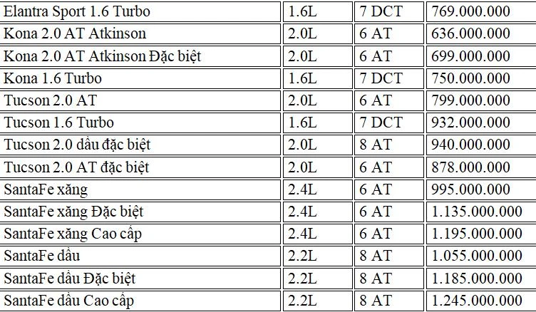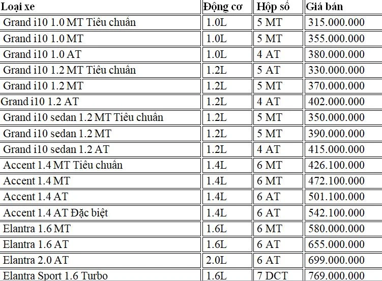 Dưới đây là chi tiết bảng giá xe Hyundai tháng 10-2019: