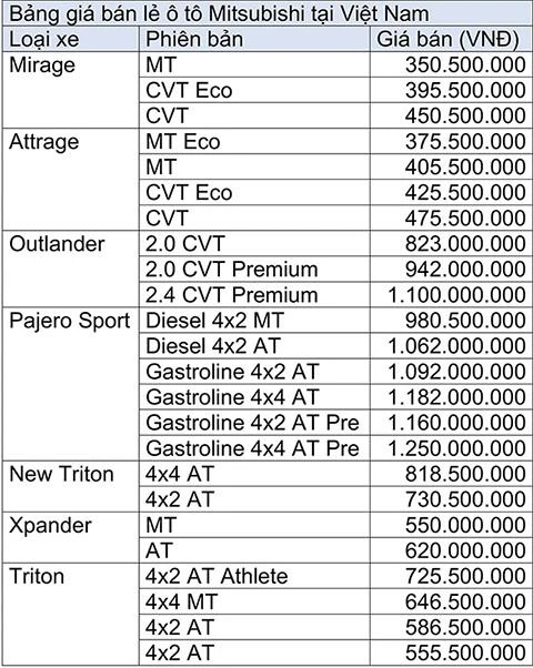 Nằm trong phân khúc xe giá rẻ, hiện Mitsubishi Mirage và Attrage cũng không có biến động lớn về giá bán. Cụ thể, trong tháng 5-2019, giá xe Mitsubishi Mirage dao động từ 350,5 triệu đến 450,5 triệu đồng.