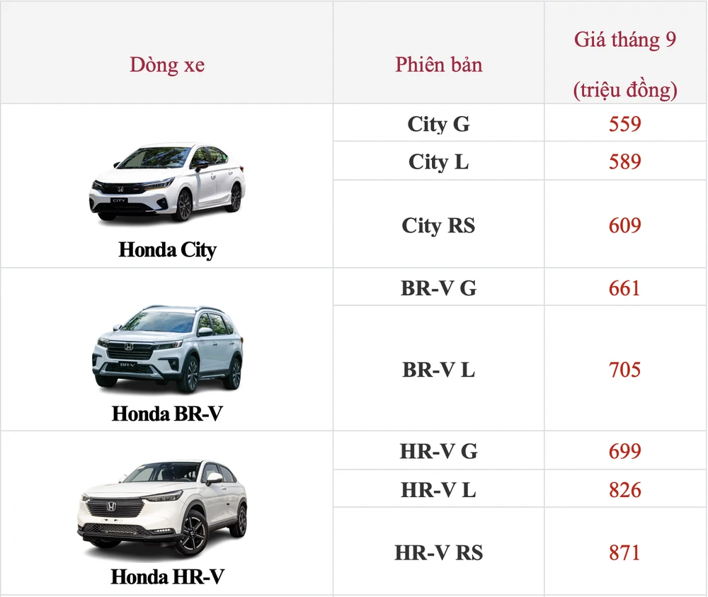 Dưới đây là bảng giá niêm yết của các mẫu ô tô Honda: