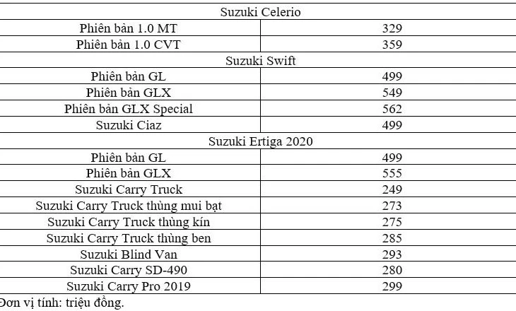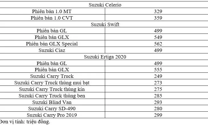 Bảng giá ô tô Suzuki tháng 2-2020 là sự xuất hiện của mẫu xe Suzuki Ertiga 2020. Với phiên bản mới này, Suzuki Ertiga vẫn bán ra với hai phiên bản gồm GL và GLX. Trong đó, giá của phiên bản GL vẫn giữ nguyên ở mức 499 triệu đồng. Còn phiên bản GLX tăng 6 triệu đồng, đẩy giá bán lên 555 triệu đồng.
