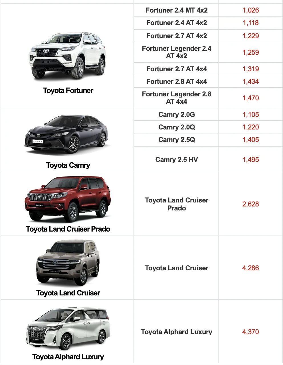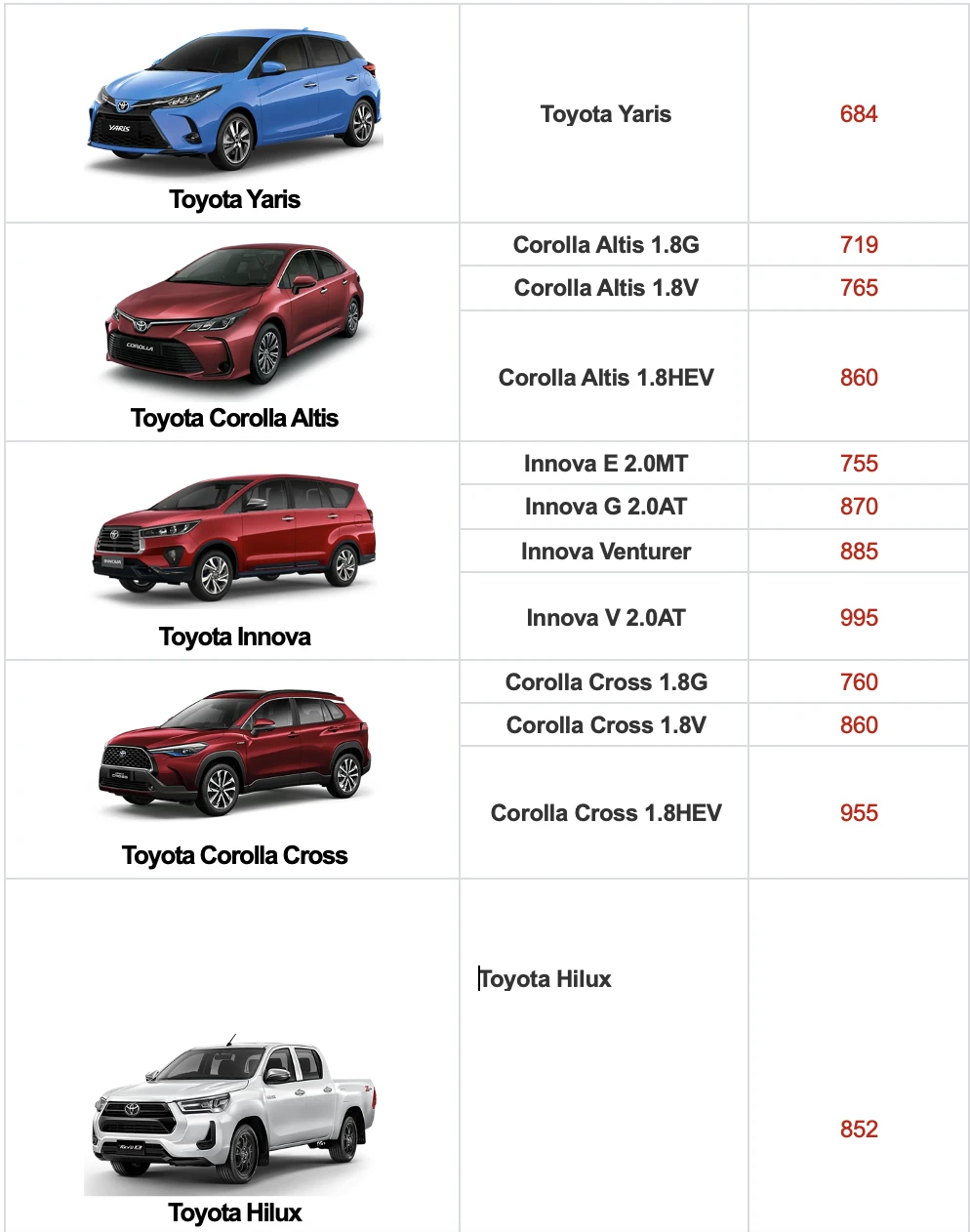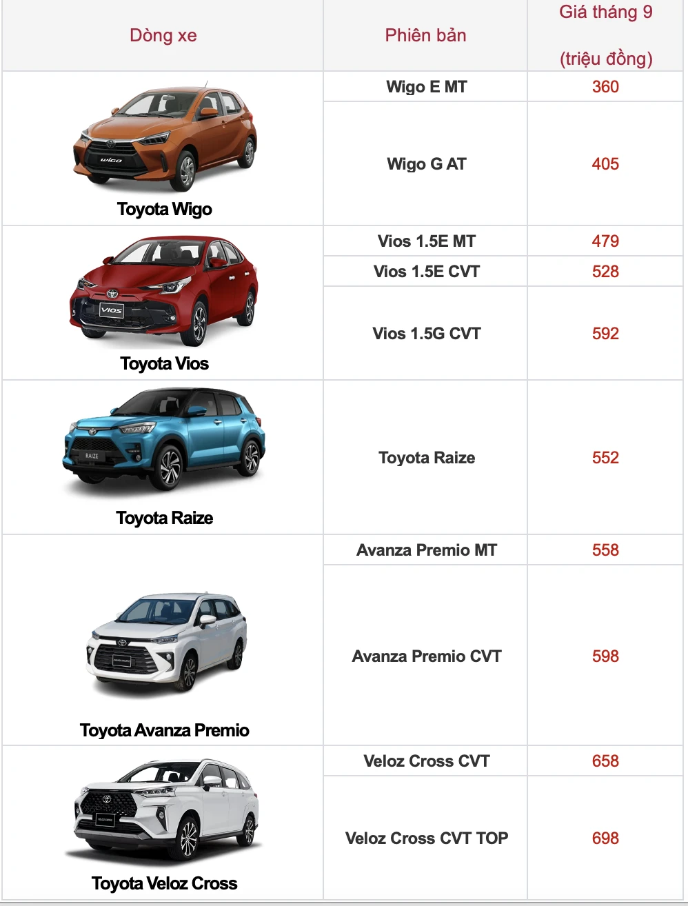 Dưới đây là bảng giá ô tô tham khảo tháng 9-2023: