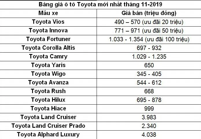 Dưới đây là bảng chi tiết giá xe Toyota tháng 11: