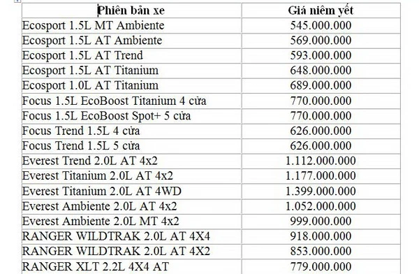 Cũng tháng 12 này, Ford Việt Nam đã công bố giá của hai phiên bản mới Everest Ambiente lần lượt là 1,052 tỉ đồng đối với bản AT và 999 triệu đồng đối với bản MT. Chương trình khuyến mãi đối với mẫu Everest, khách hàng sẽ được mức ưu đãi một năm bảo dưỡng trọn gói cho phiên bản Everest Ambiente 2.0L AT.