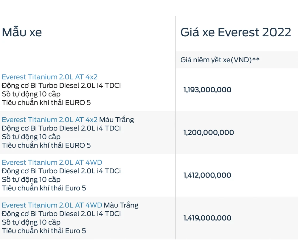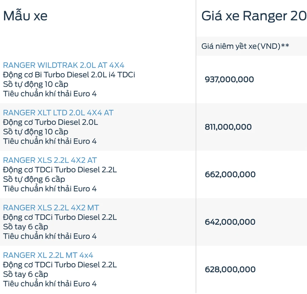 Cụ thể, hãng Ford đã tăng giá của Everest và Ranger khoảng 12 triệu đồng. Theo đó, giá bán mới của hai mẫu xe này có giá lần lượt là 1.193-1.419 triệu đồng và 628-937 triệu đồng.