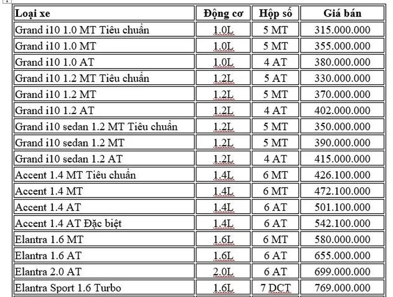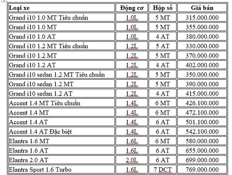 Cụ thể, mẫu xe rẻ nhất của TC Motor chính là Grand i10 với giá 315 triệu đồng. Hiện nay tại thị trường Việt Nam, Grand i10 bán ra với 9 phiên bản bao gồm cả hatback và sedan. Mức giá bán ra dao động từ 315-402 triệu đồng.