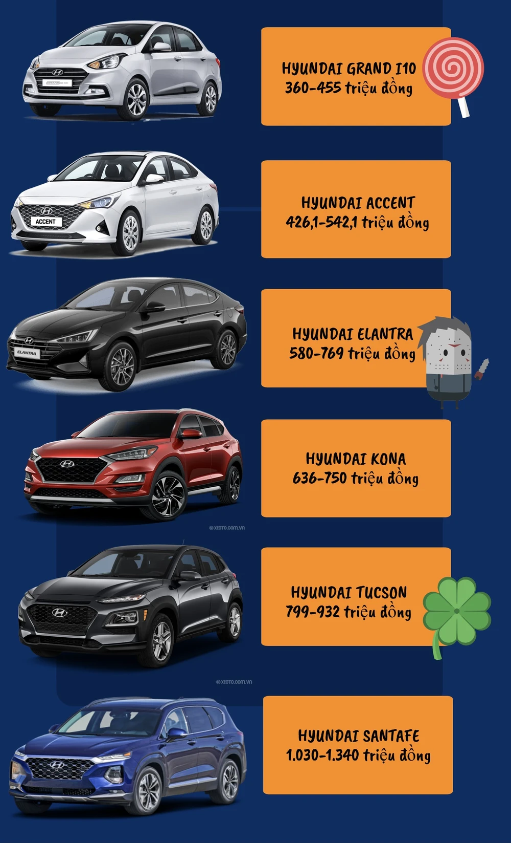 Trong đó mẫu xe có giá lăn bánh rẻ nhất của Hyundai là Grand i10 với 5 phiên bản có giá dao động từ 400-469 triệu đồng.