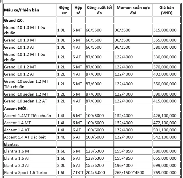 Dưới đây là chi tiết giá bán của các mẫu xe Hyundai tháng 2-2021: