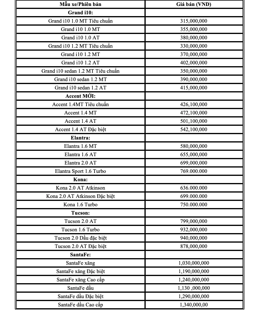 Các mẫu xe khác đều có giá bình ổn với các chương trình ưu đãi từ 10-30 triệu đồng. Trong đó, mẫu xe có mức giá rẻ nhất là Hyundai Grand i10 với giá 315 triệu đồng.
