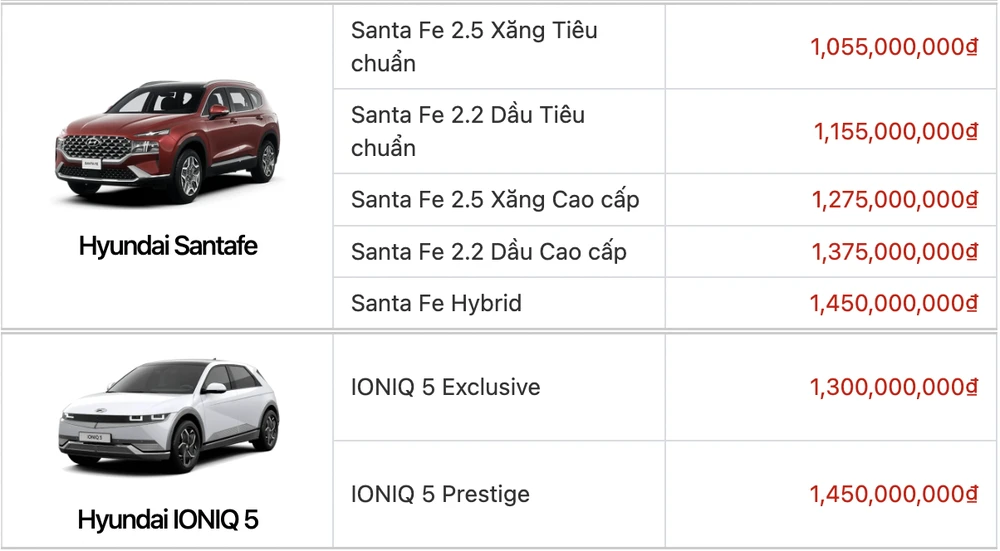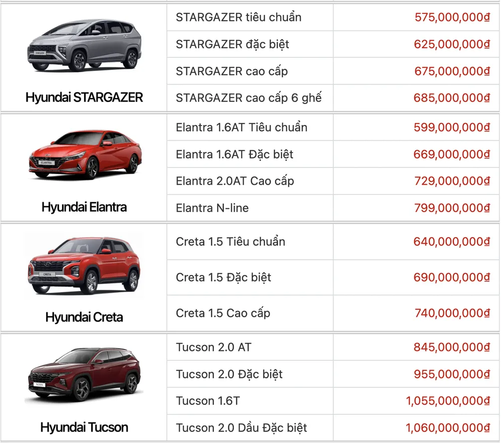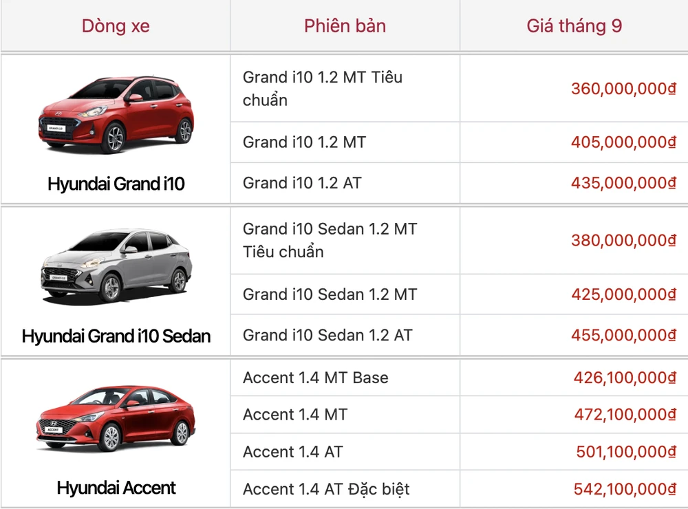 Dưới đây là bảng giá ô tô Hyundai tháng 9-2023, chưa bao gồm các chương trình ưu đãi và giảm 50% lệ phí trước bạ: