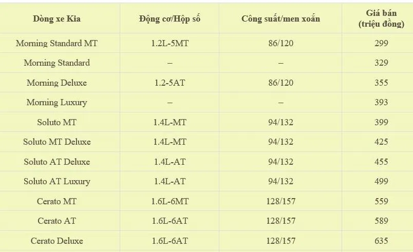 Kia Cerato 2020 hiện đang bao gồm các phiên bản: Cerato MT giá 559 triệu đồng, Cerato AT 589 triệu đồng, Cerato Deluxe 635 triệu đồng và Cerato Premium 675 triệu đồng.