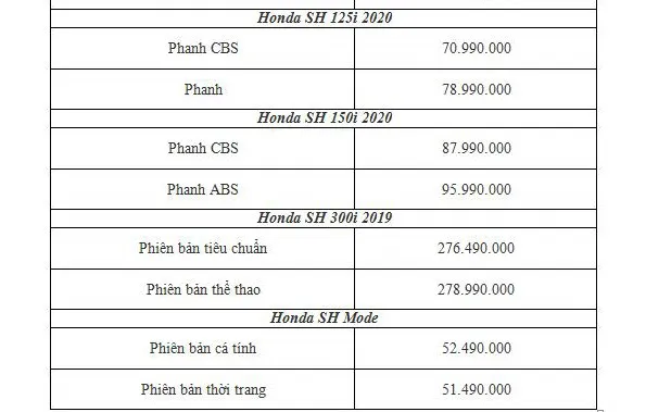 Ngược lại với các mẫu xe trên, Honda SH các phiên bản từ SH Mode đến SH 150i đều tăng mạnh. Đặc biệt các phiên bản Honda SH 2019, có thời điểm mẫu xe này có giá bán chênh lệch lên đến 30 triệu đồng.