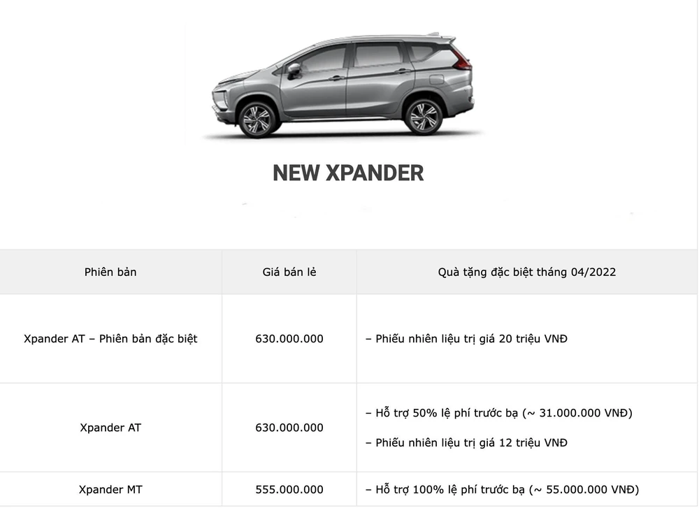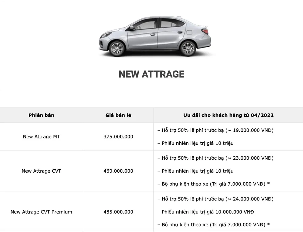 Cụ thể, khách hàng mua Attrage trong tháng 4 ngoài việc được ưu đãi lệ phí trước bạ từ 19-24 triệu đồng còn được tặng phiếu nhiên liệu trị giá 10 triệu đồng.