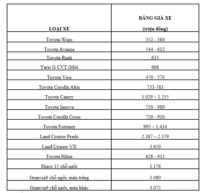Trong đó, mẫu xe rẻ nhất có giá 352 triệu đồng. Còn mẫu xe cao nhất có giá 3.080 triệu đồng đó là mẫu Toyota Granvian.