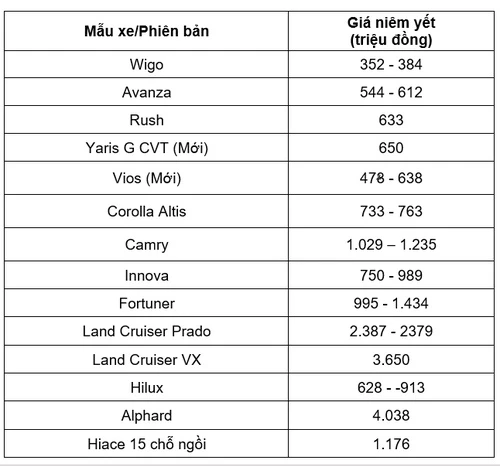 Theo đó, giá xe Toyota Vios 2021 sau khi điều chỉnh từ 478 triệu đồng, mẫu Collora Cross từ 720 triệu đồng, Collora Altis từ 733 triệu đồng. Giá xe Fortuner từ 995 triệu đồng, giá xe Camry từ 1,02 tỉ đồng, giá xe Yaris và Rush lần lượt từ 688 triệu đồng và 663 triệu đồng.