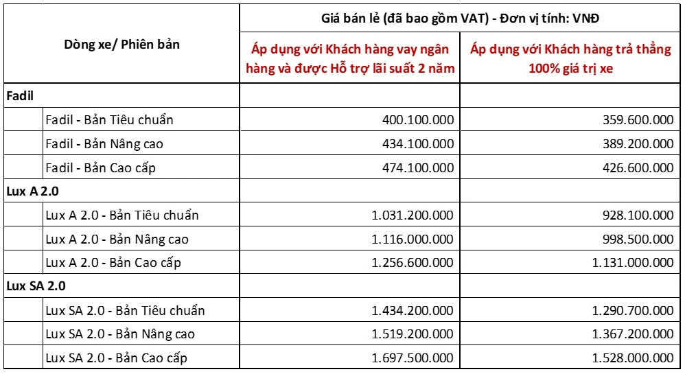 Theo đó, tất cả khách hàng mua ô tô VinFast Lux A2.0 và Lux SA2.0 đều được hưởng giá mới sau khi trừ trực tiếp Hỗ trợ lệ phí trước bạ và Quà tri ân (có giá trị lần lượt là 80 triệu đồng dành cho VinFast Lux A2.0 và 120 triệu đồng cho VinFast Lux SA2.0).