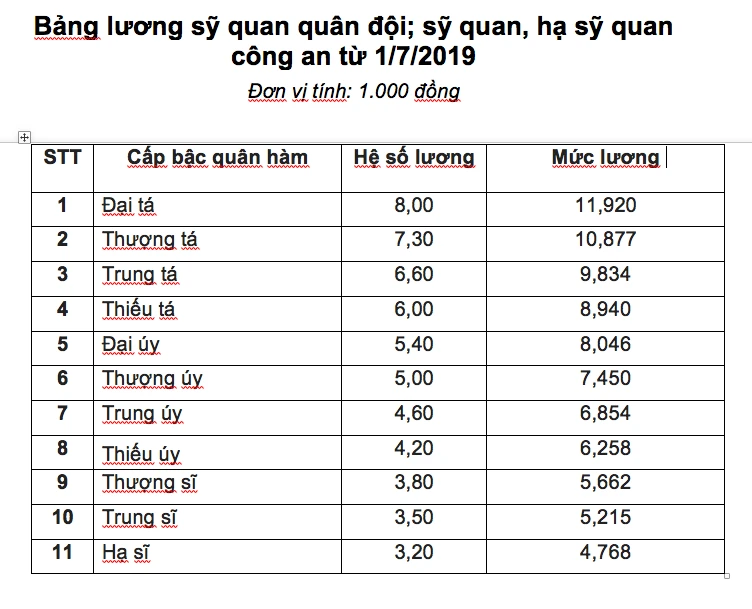 Cụ thể, hệ số lương của cấp bậc quân hàm đại tá là 8.00 thì sẽ có mức lương tương ứng: 8 x 1.490.000 = 11,920 triệu đồng. So với mức lương trước ngày 1-7-2019 là 11,120 triệu đồng, tăng 800 ngàn đồng.