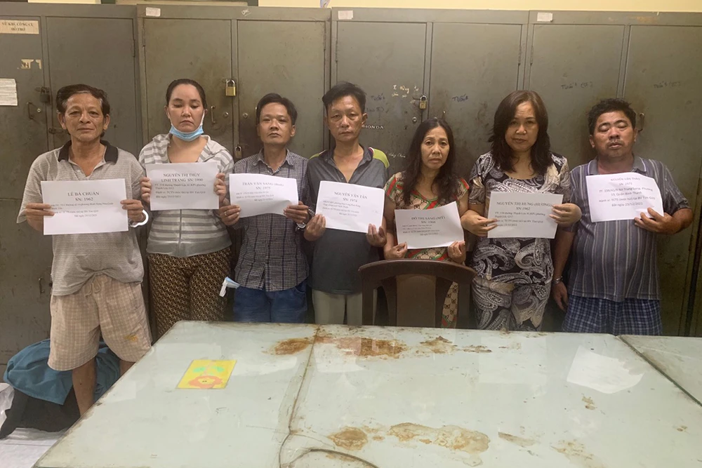 Những người này gồm Nguyễn Văn Tân (47 tuổi, quê Ninh Thuận), Đỗ Thị Sáng (55 tuổi, ngụ quận 4), Nguyễn Thị Hưng (59 tuổi), Nguyễn Văn Thảo (50 tuổi, cùng ngụ quận 12), Nguyễn Thị Thùy Linh Trang (31 tuổi, con gái Hưng), Trần Văn Sang (46 tuổi, quê Đồng Nai).