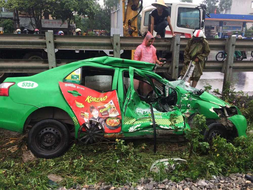 Theo quan sát, sau sự việc chiếc taxi bị biến dạng nặng, hai cột thông tin trên đường sắt bị hư hại.