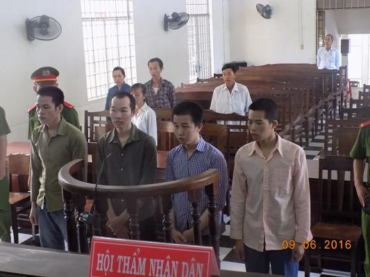 Từ trái qua: Các bị cáo Hạnh, Dương, Tình và Phúc tại phiên tòa.